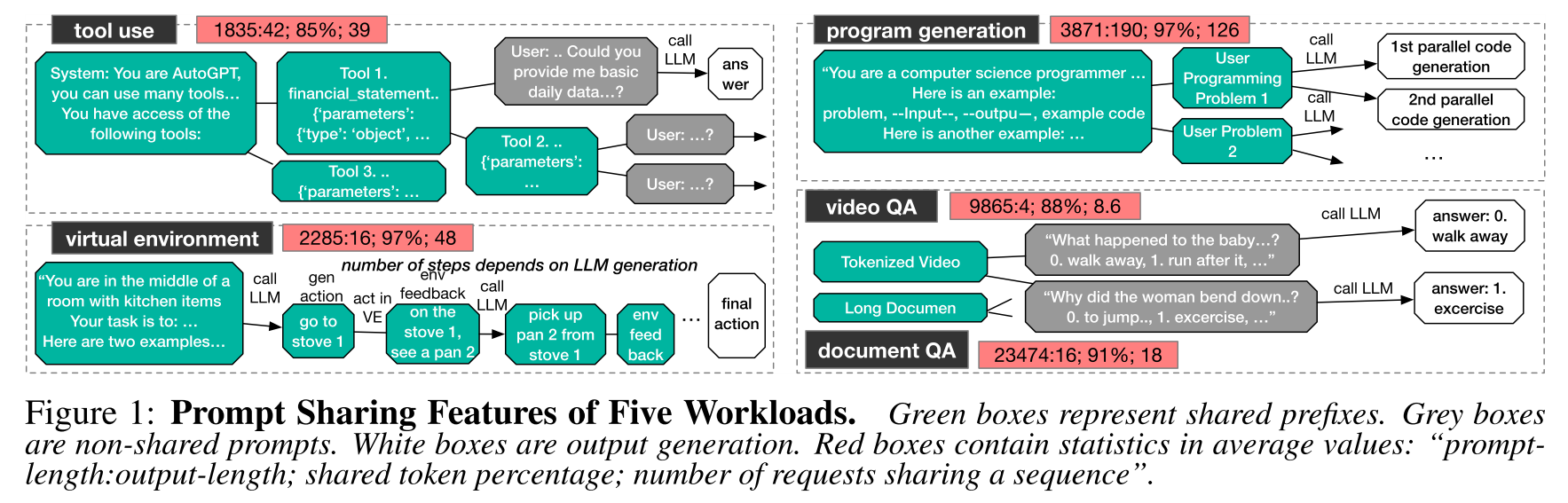 • 不同工作负载 prompts/response token 数之比、共享前缀比例、共享一个前缀的 request 数量: