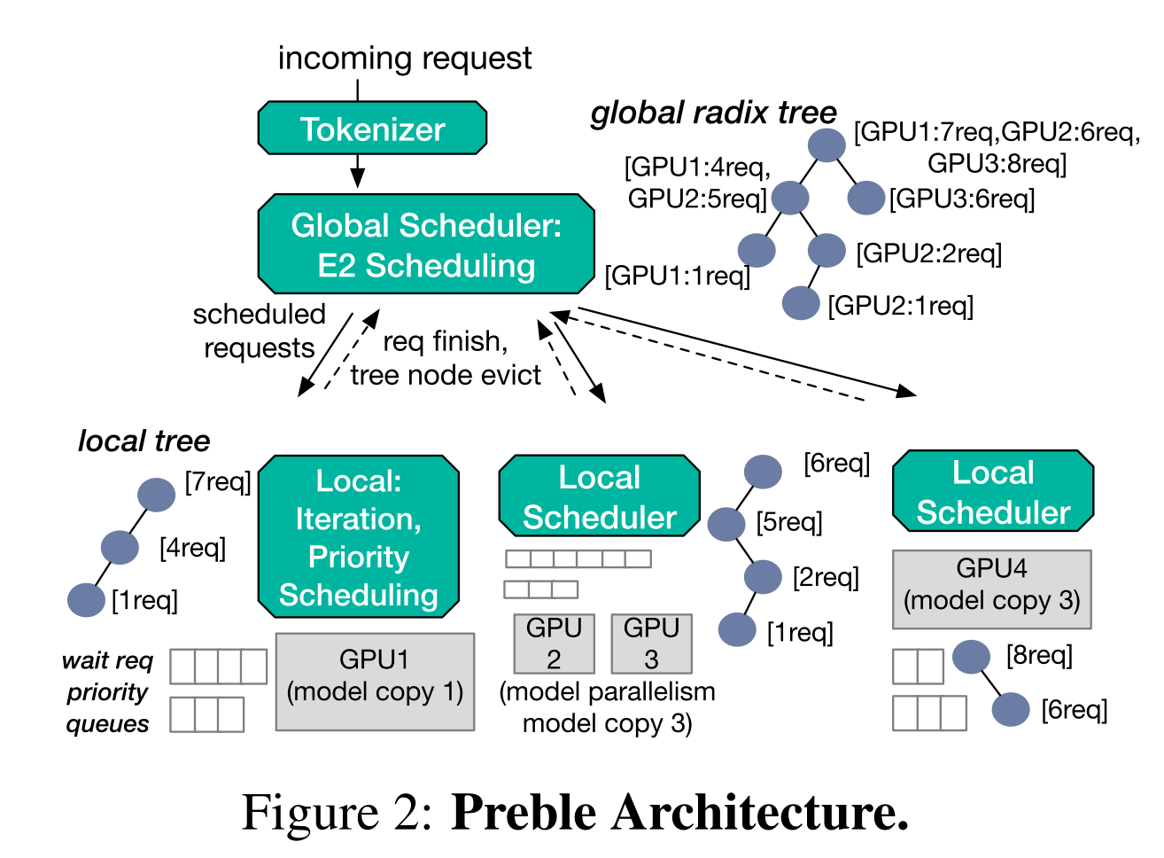 • global scheduler 维护一个请求前缀热度树(request prefix hotness tree),每个节点记录前缀信息。哈希函数的输入(hash prefix)就是从根节点到叶子节点路径。