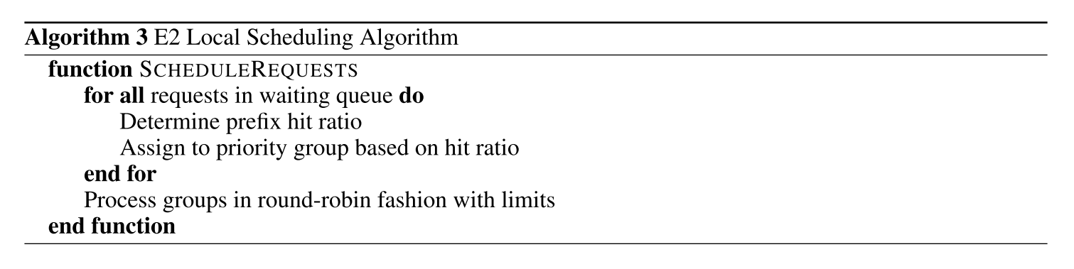 • 同时考虑排队时间与 KV Cache 复用减少重计算开销:划分 \(P\) 个队列,根据 prompts 前缀匹配比例将 request 划分到某个队列。选择 request 组成一个 batch 执行时,从匹配比例高的队列中选择较多的 request,按照匹配比例递减。