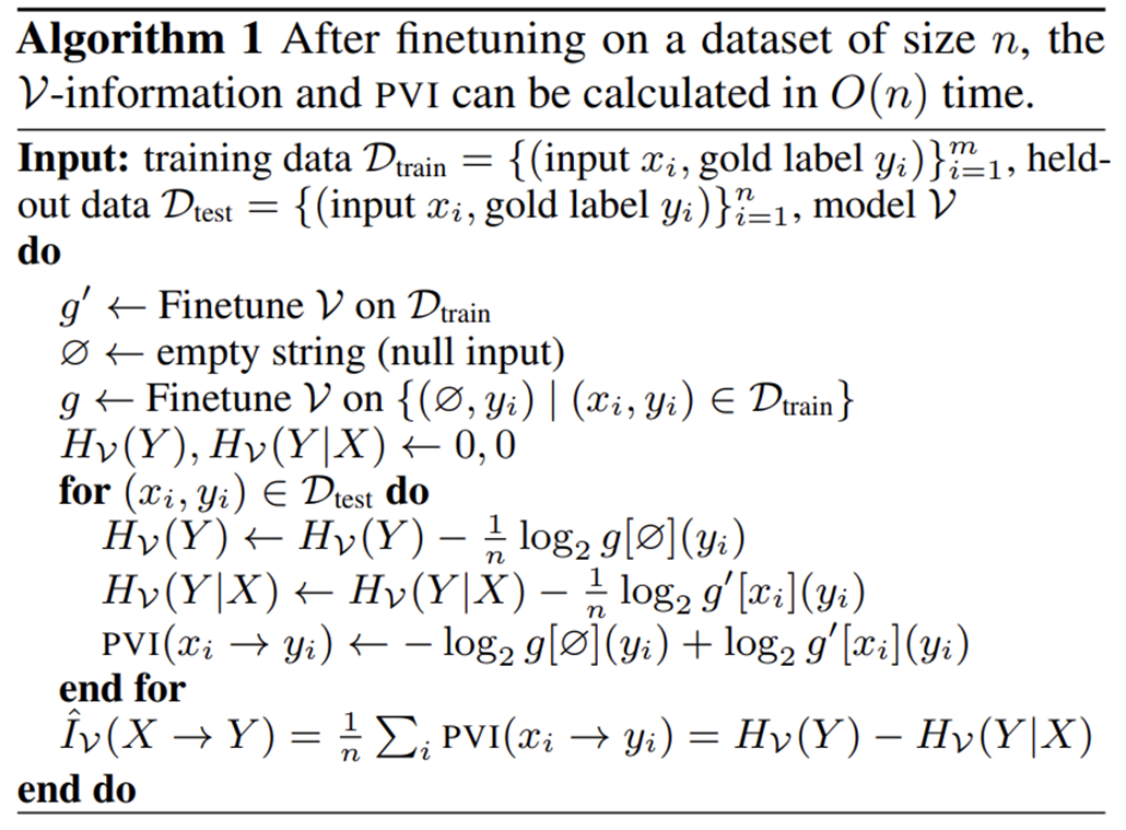然后,引入评估样本点 \(\mathcal{V}\)-Information (Pointwise \(\mathcal{V}\)-Information,PVI)的方法: